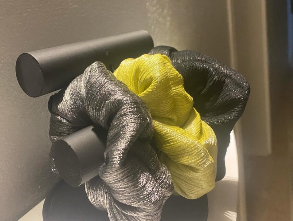 Parlak, ipek görünümlü kumaş kaplı elastik saç tokaları, canlı sarı ve gri renklerde, avangart tarz için uygun.