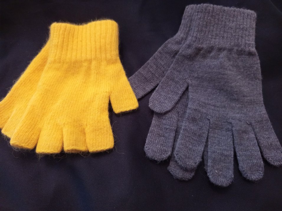 Yumuşak örgü kumaştan yapılmış sarı ve gri kadın eldivenleri, rahat ve sade bir stil sunar. gri olan erkek içinde olabilir