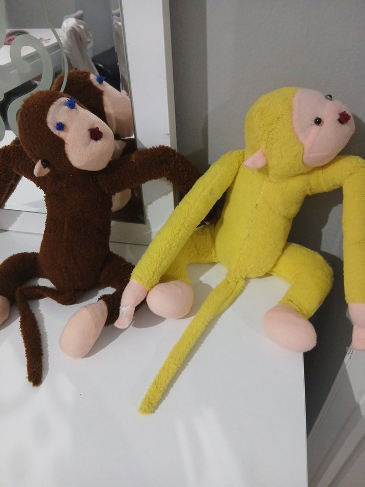 Yumuşak kumaştan yapılmış, detaylı yüzlü, uzun kuyruklu sarı ve kahverengi peluş maymun oyuncakları.