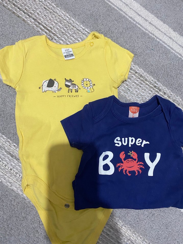 Sarı kısa kollu, hayvan desenli ve lacivert "Super Boy" yazılı kısa kollu iki adet pamuklu erkek bebek body takımı. Velcro çıtçıtlı.