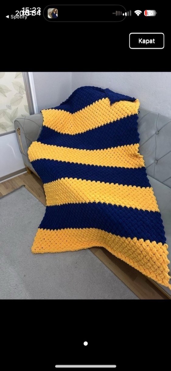 Kalın örgü tekniğiyle örülmüş sarı ve lacivert şeritlerden oluşan sıcak tutan bir battaniye.