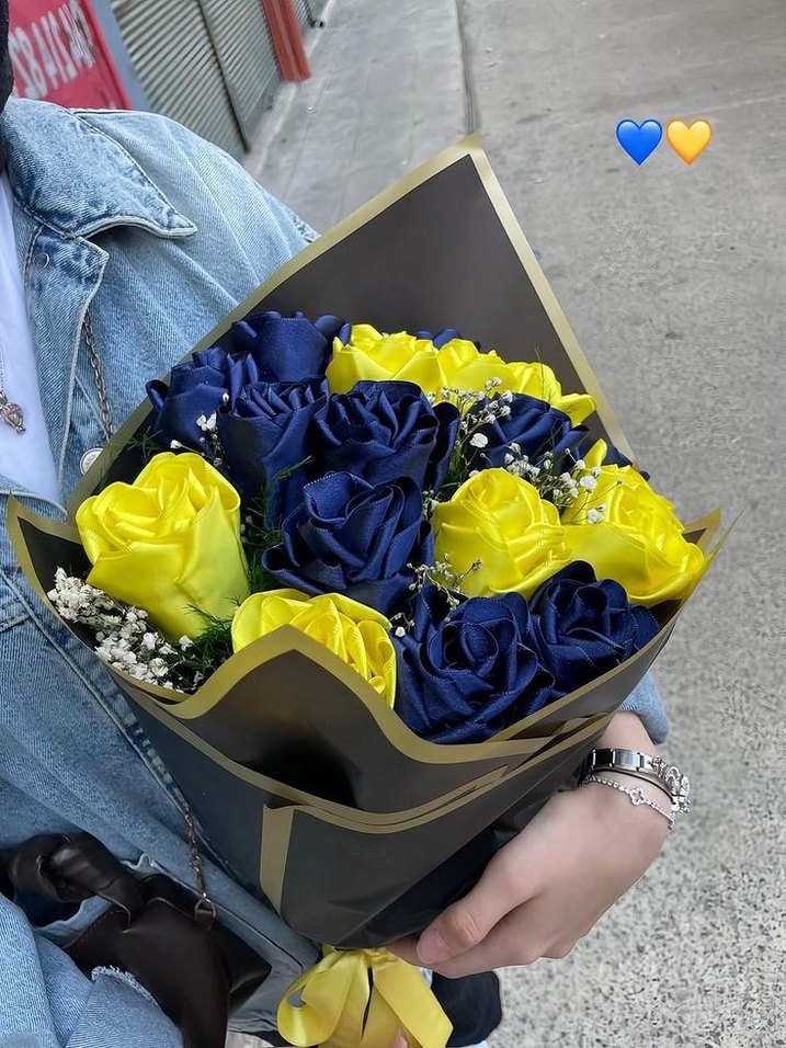 Siyah ve altın renkli kağıda sarılı, sentetik kumaştan yapılmış koyu sarı ve lacivert güllerden oluşan buket. istediğiniz renkte ve gül adetinde sipariş olustura bilirsiniz