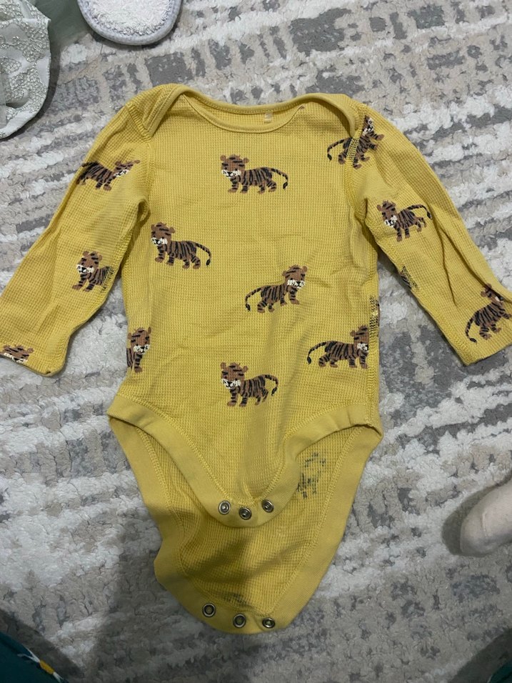 Sarı, uzun kollu, zebra desenli bebek body. Bisiklet yaka ve örgü görünümlü sentetik kumaştan, sokak stili için uygun.