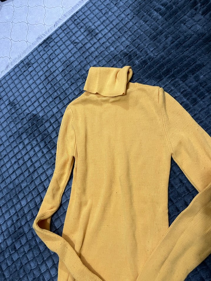 Sarı balıkçı yaka, uzun kollu, ince ve örgü dokulu kadın triko kazak. Normal boyda, sade tasarımlı, rahat ve şık bir günlük kazak.