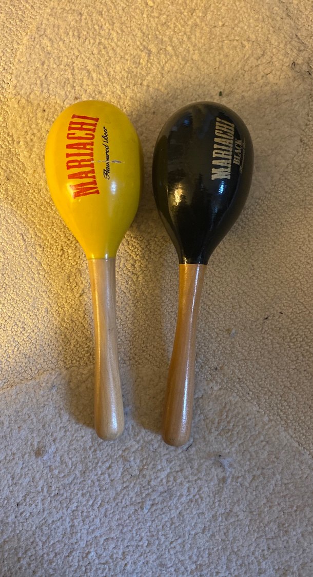 Ahşap saplı, biri canlı sarı diğeri koyu siyah renkte, üzerinde 'MARIACHI' yazılı marakas çifti.