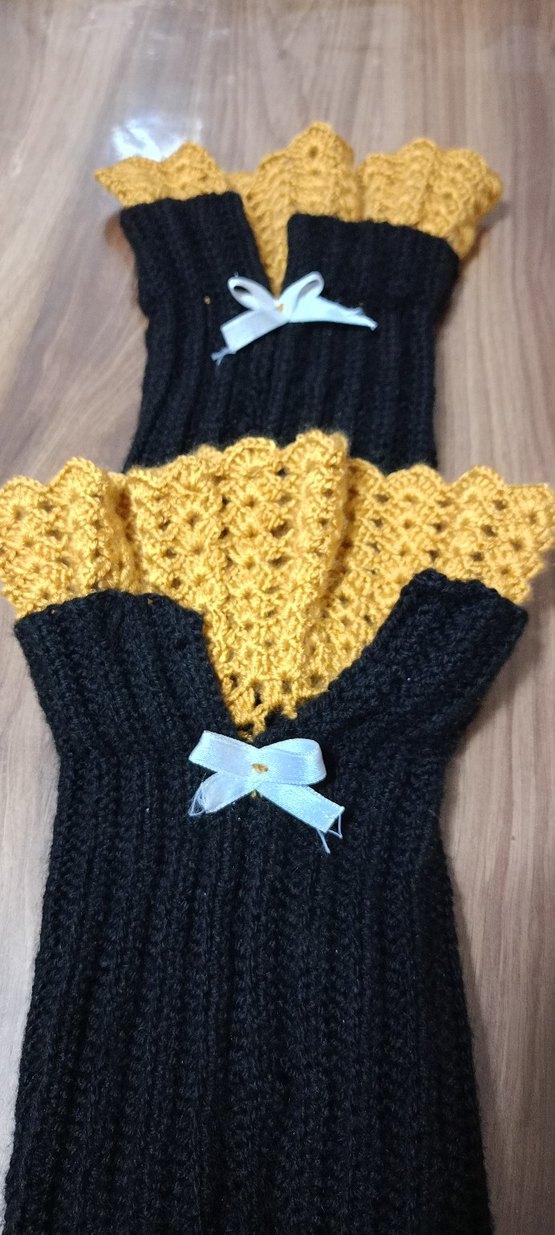 Kadın eldivenleri, koyu sarı ve siyah renklerde küçük beyaz fiyonk detaylı örgü dokusuna sahip, rahat ve eski tarz gotik görünümlüdür.