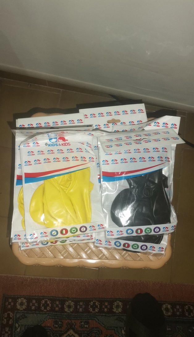 Parlak sarı ve siyah renkte, çeşitli kutlamalar için uygun parti balonları paket halinde.