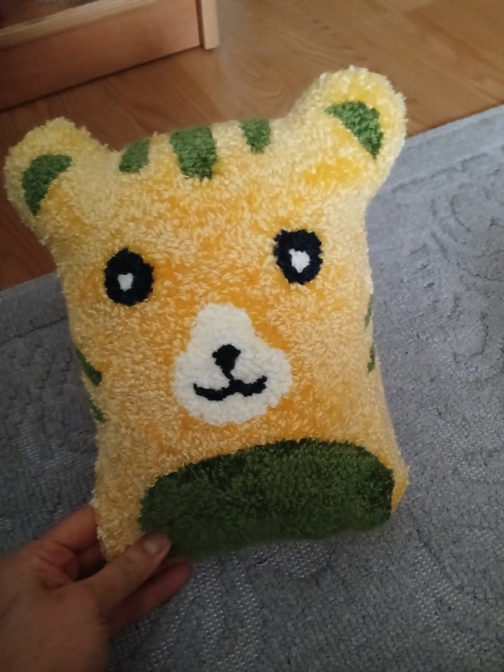 Yumuşak dokulu, sarı ve yeşil renkli, sevimli yüz ifadeli peluş oyuncak ayıcık. Sarılmak ve süslemek için uygun.