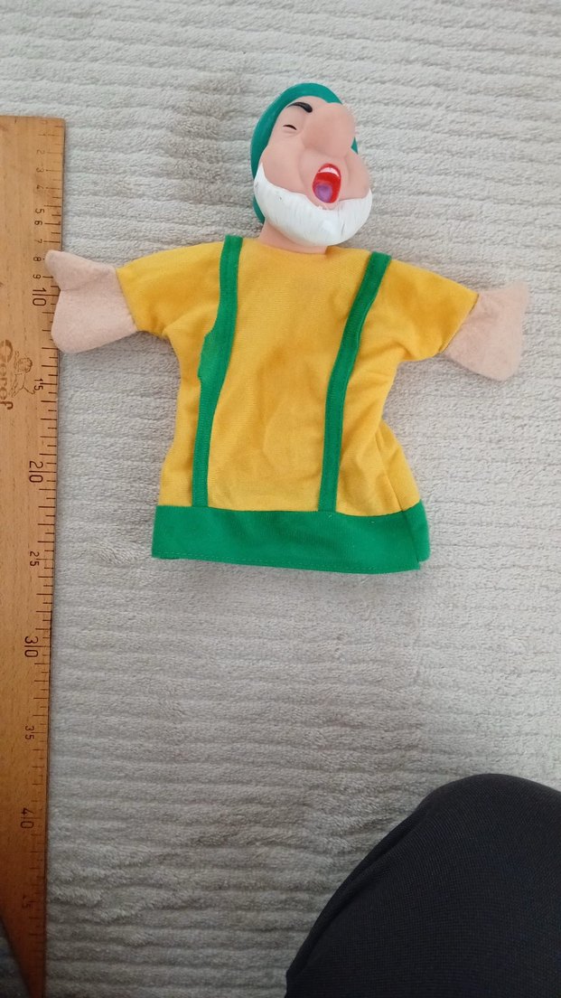 Sarı renkte, yeşil detaylı, beyaz sakallı karakter şeklinde yumuşak peluş oyuncak. Oyun için uygundur. Kukladır