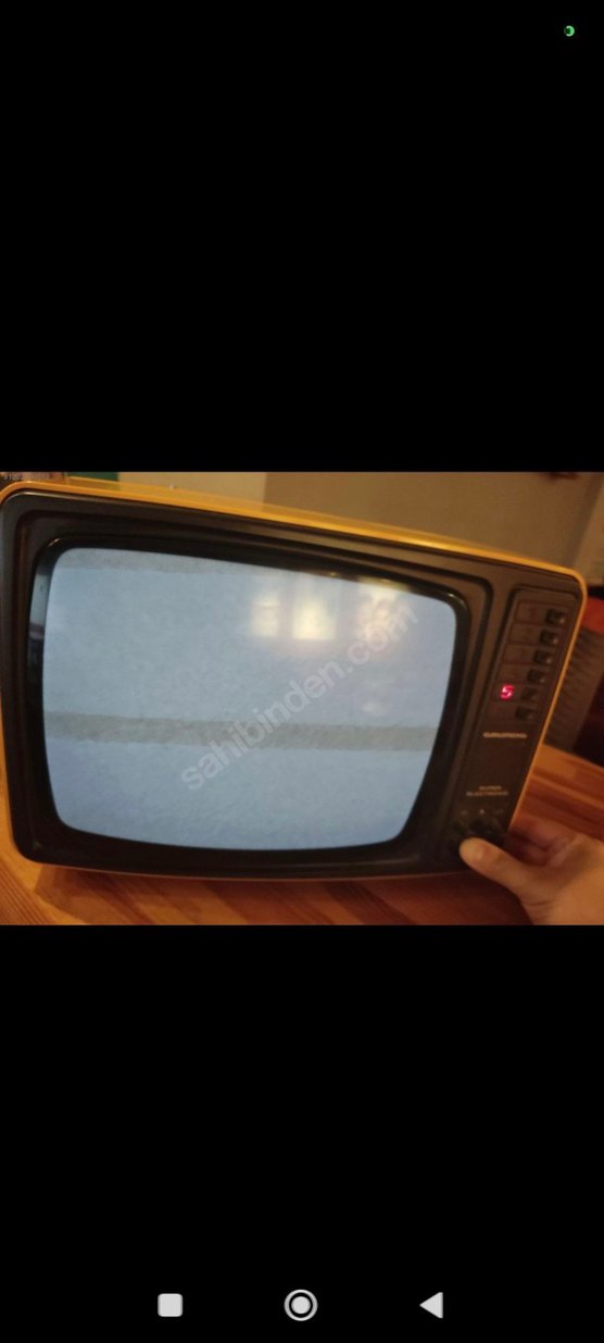 Yanında manuel kontrol düğmeleri ve yuvarlak ekranı olan bej renk retro monitör.