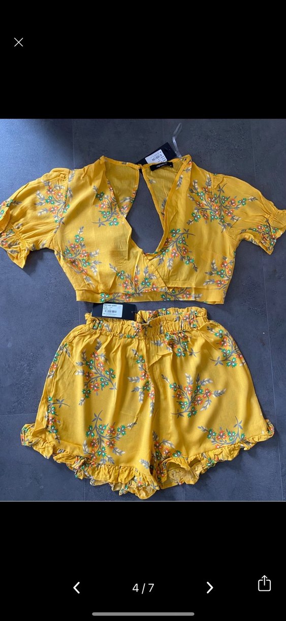 M Beden (38) Ürün yeni ve etiketlidir %100 Viscon Crop uzunluk:38 cm Koltuk Altı Ölçüsü: 52 cm Crop İpli bağlanarak ayarlanabiliyor. Şort Uzunluk 44 cm Bel Lastiklş Rahat Kesim . Sarı renkli, çiçek desenli kadın mini tulum, V yaka ve kısa kollu, bol kesimdir. Sentetik kumaştan yapılmış, volan detaylarıyla bohem tarzını yansıtır.