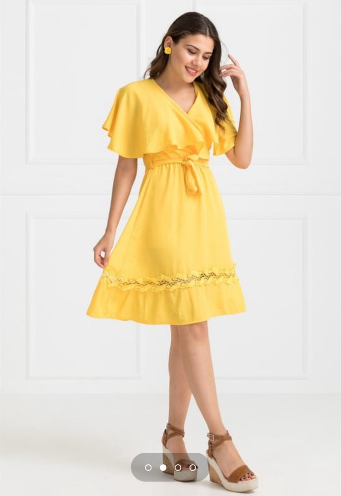 Sarı midi elbise, V yakalı, kısa volanlı kollu, nakış detaylı ve parlak görünümlü, bol kesim, düğün için uygun.