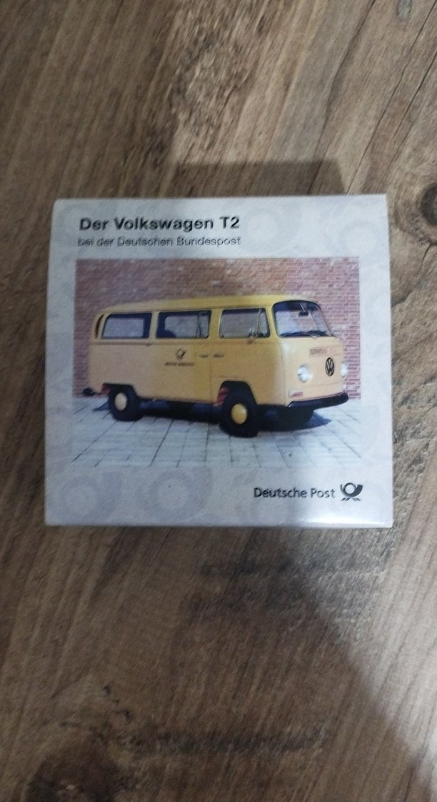 Sarı renkte, Deutsche Post için üretilmiş Volkswagen T2 model oyuncak araba. Detaylı tasarıma sahip, koyu sarı renkte.