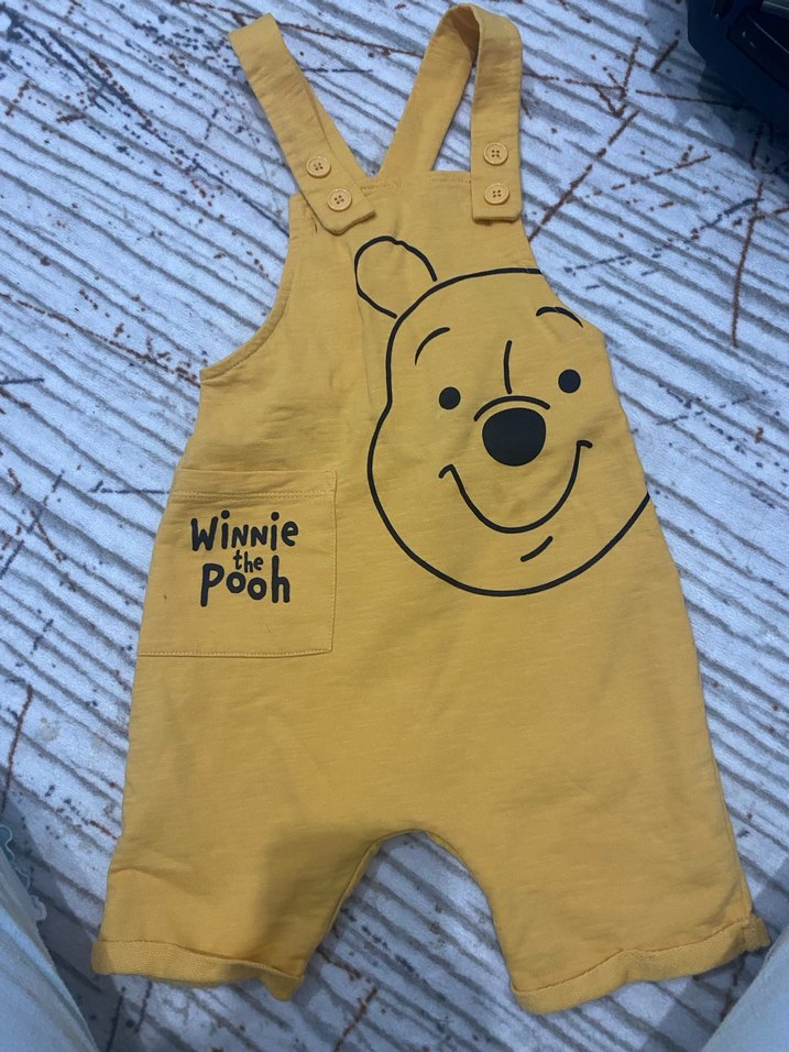 Sarı renkli, yumuşak ve sıcak kumaştan yapılmış, kolsuz, bol kesim erkek çocuk tulumu. Winnie the Pooh baskısı ve tokalı askıları vardır. 18 24 ay lekesizdir
