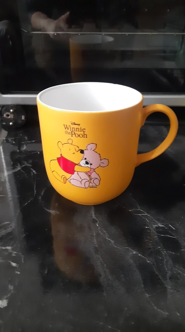 Sarı renkte, Winnie the Pooh ve ayıcık figürlü, beyaz iç yüzeyli ve kulplu kupa. ☕