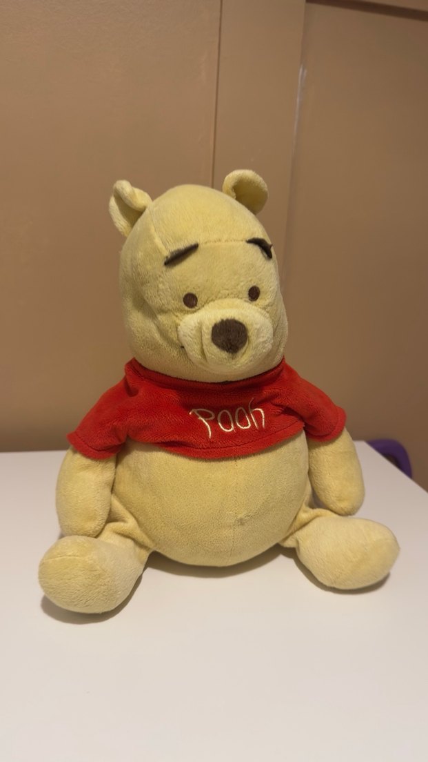 Yumuşak kumaştan yapılmış, kırmızı gömlekli ve "Pooh" işlemeli sarı Winnie the Pooh peluş oyuncak. Renkli ve sarılmaya uygun.