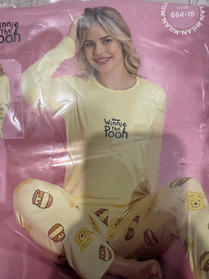 Bol kesim, uzun kollu, pastel sarı renkli Winnie the Pooh baskılı kadın pijama takımı, rahat ve sokak stili uyumlu.