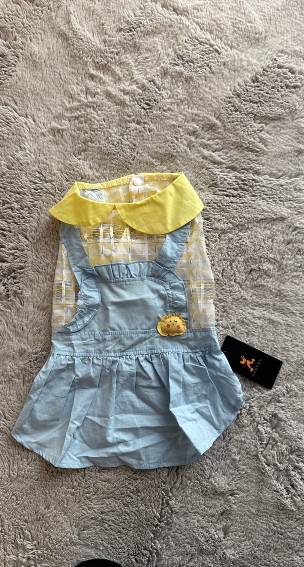 Pastel sarı yakalı ve açık mavi fırfırlı etek detaylı köpek -Kedi elbisesi, rahat sokak stiline uygun.