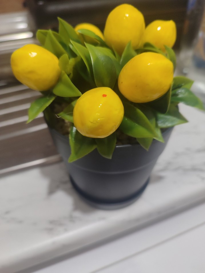 Siyah saksıda canlı yeşil yapraklar ve parlak sarı yapay limonlar bulunan renkli ev dekoru.