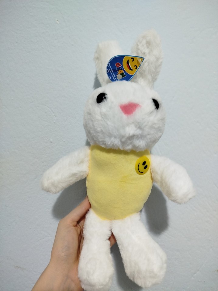 Sarı yelekli ve gülen yüz rozeti olan yumuşak beyaz peluş tavşan oyuncak. Renkli ve sarı detaylıdır.