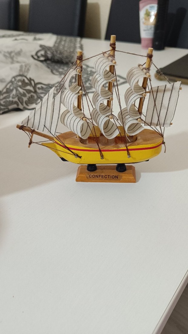 Açık sarı renkte, beyaz yelkenli ve "CONFECTION" yazılı ahşap kaideli yelkenli gemi figürü. ⛵