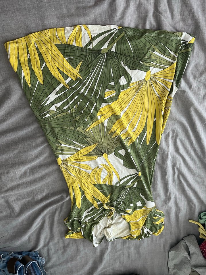 Sarı ve yeşil tropikal yaprak desenli, kısa ve dar kesim vucuda oturan elbise. Yumuşak yeri müthiş kumaştan, dış mekan kullanımı için bohem tarzda.
