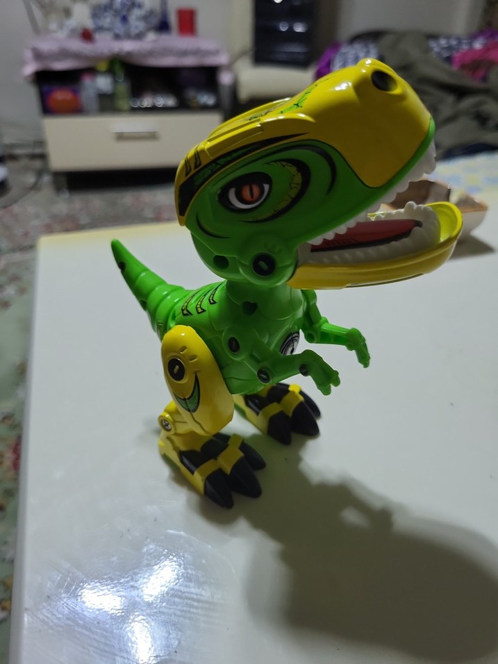 Canlı sarı ve yeşil renkte, hareketli uzuvlara sahip dinozor aksiyon figürü. Koleksiyon ve oyun için uygun. sesli ışıklı kusursuz