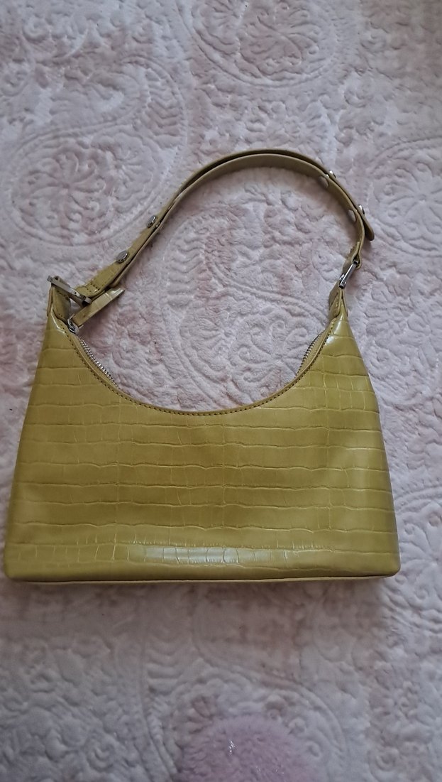 Sarı renkte, yılan derisi desenli deri çanta, tokalı askıya sahip. Trendy casual sokak stili için uygundur, günlük kullanım için ideal.