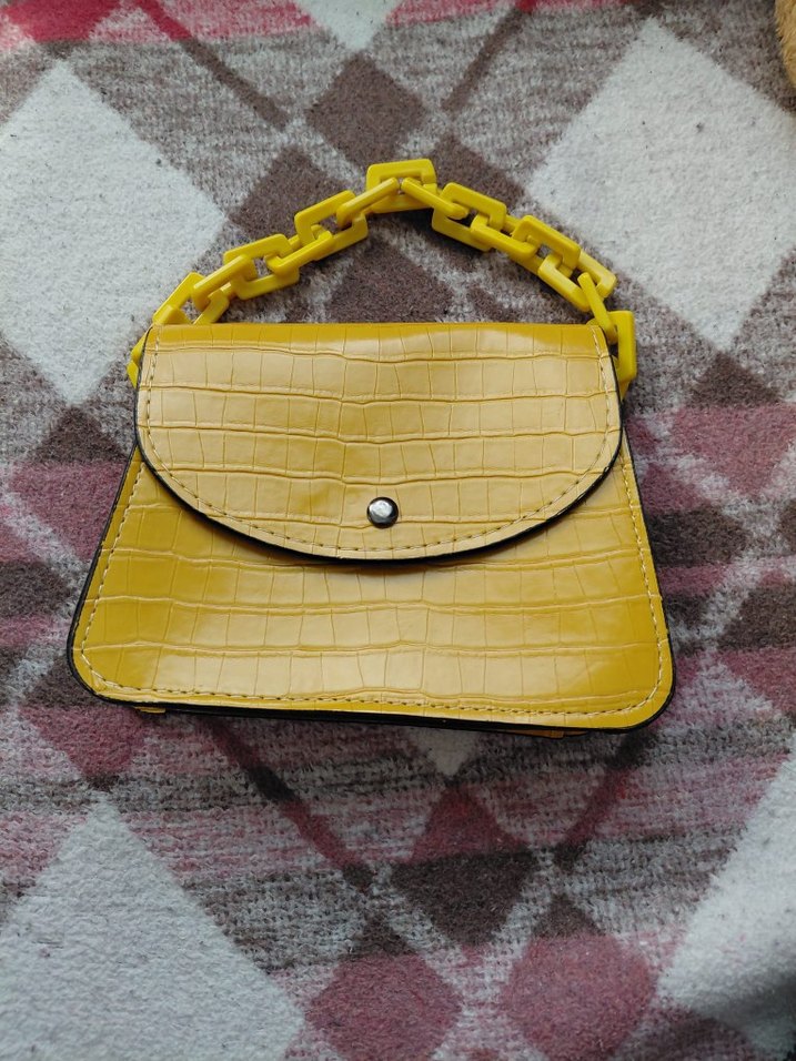 Sarı deri kadın çanta, yılan derisi desenli ve zincir saplıdır. hiç kullanılmadı sıfır