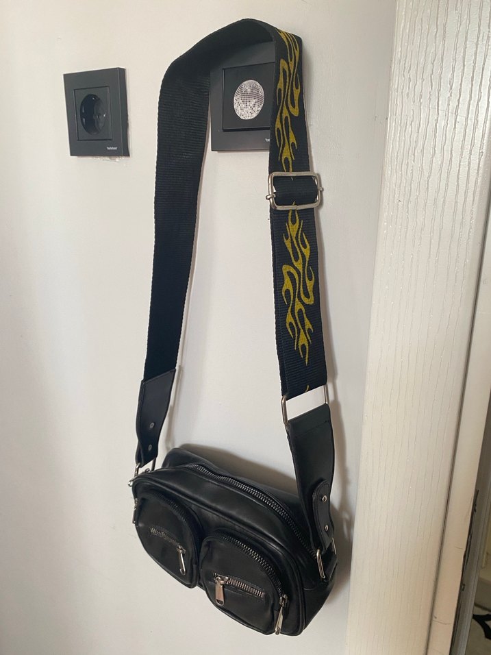 Siyah sarı yılan desenli deri çapraz çanta, ayarlanabilir tokalı kayış ve alev deseniyle rock punk tarzına uygun.