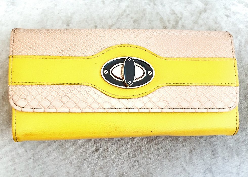 Sarı renkli, yılan desenli deri kadın portföy cüzdan, tokalı kapanışıyla vintage ve modern klasik tarzı bir araya getiriyor. Kullanılmamıştır.