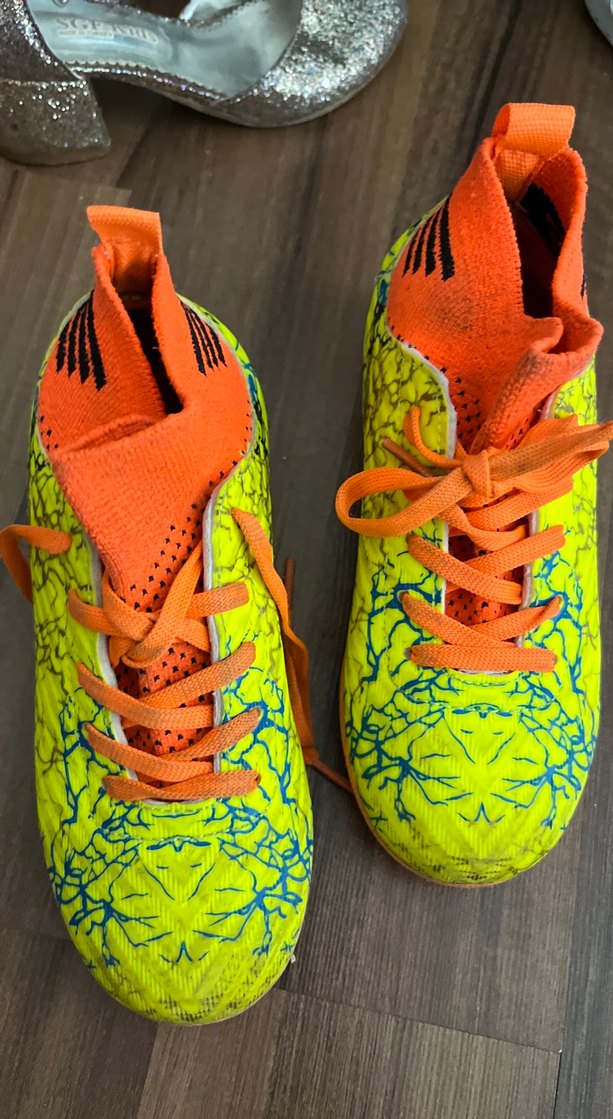 Sarı yılan desenli, turuncu detaylı erkek çocuk spor ayakkabısı. Kauçuk tabanlı ve kolay kullanım için cırt cırtlıdır.