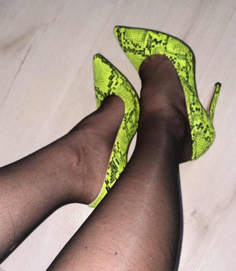 Sarı yılan desenli, dantel detaylı ve sentetik kumaştan yapılmış stiletto topuklu ayakkabı. Romantik gece için şık ve çağdaş bir seçenek.