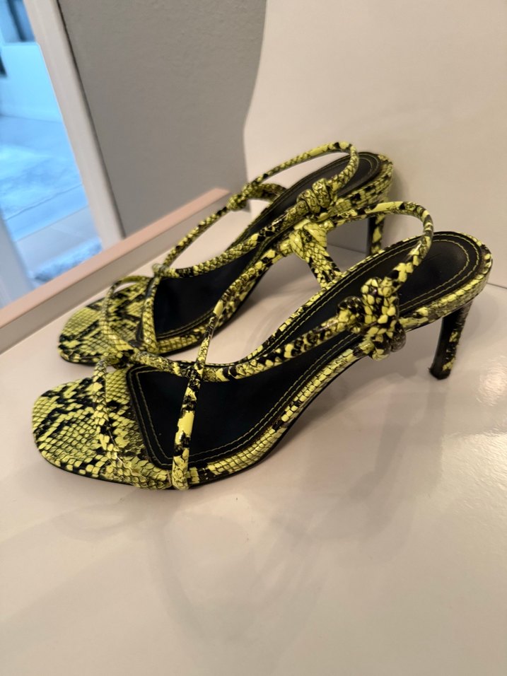Tokalı bantlara sahip sarı yılan desenli stiletto topuklu sandalet, romantik akşamlar için şık ve çağdaş bir seçim.