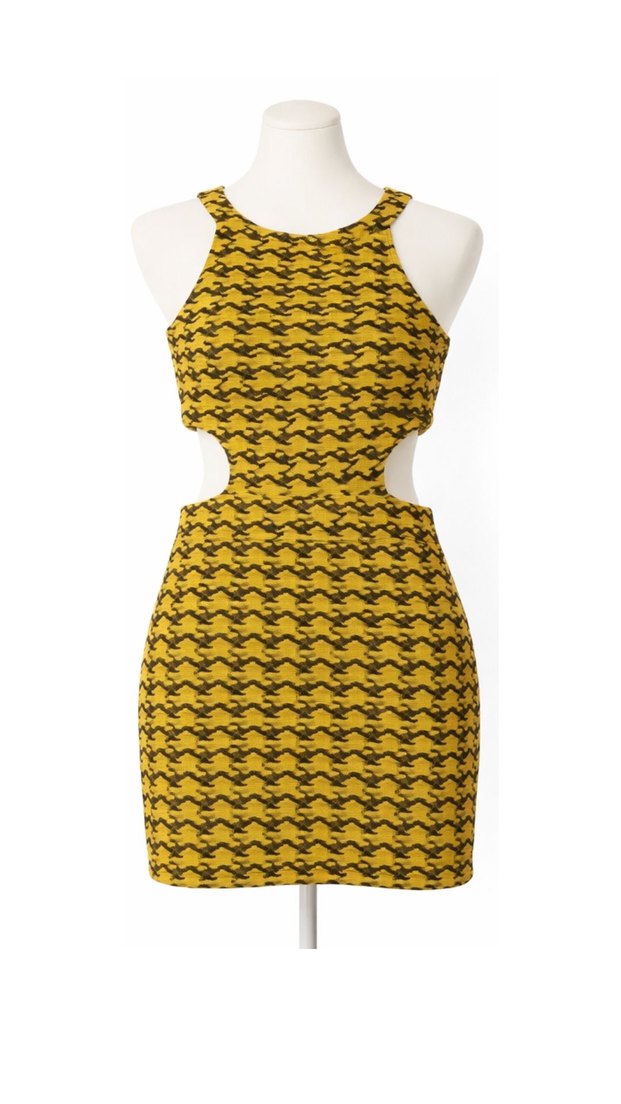 Sarı renkli, yılan desenli, pileli detaylara sahip, kolsuz ve vücuda oturan uzun gece elbisesi, çağdaş ve avangart tarzda.
