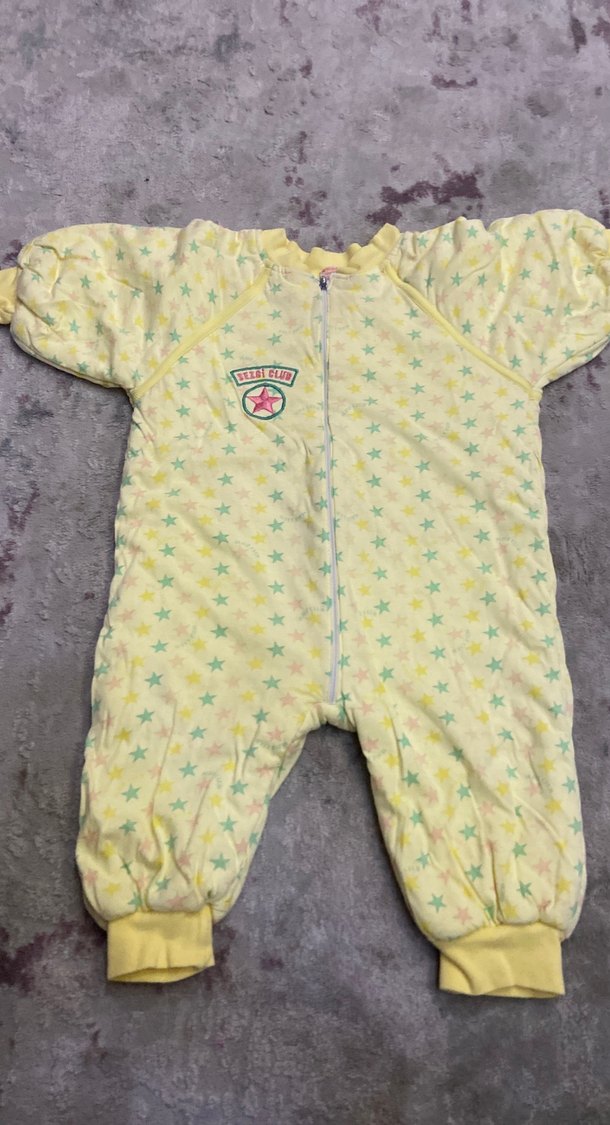 Pastel sarı renkte, yıldız desenli bebek tulumu. Fermuarlı ve straplez yakalı, yumuşak ve rahat kumaşlıdır. ❄️