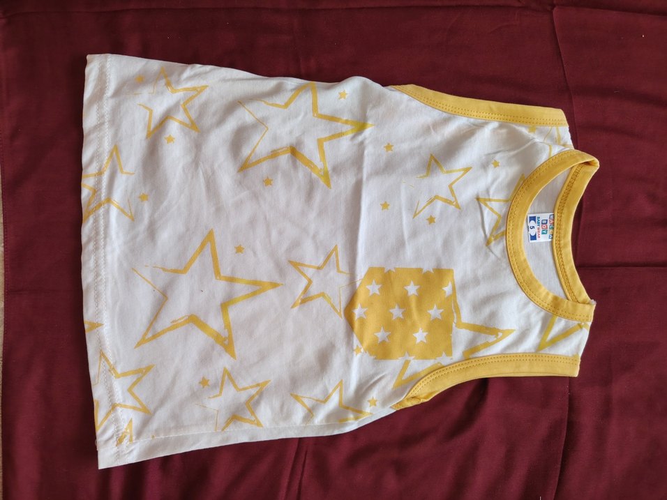 Canlı sarı yıldız desenleriyle beyaz zemin üzerinde çocuk atlet. Sarı kenarlıklara sahip.