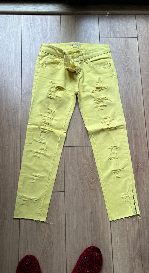 Sarı renkli, parlak görünümlü denim jean. Normal boy ve midi kesimde, yırtık detayları ve paçalarda yırtmaç bulunur. Rahat ve günlük kullanıma uygun.