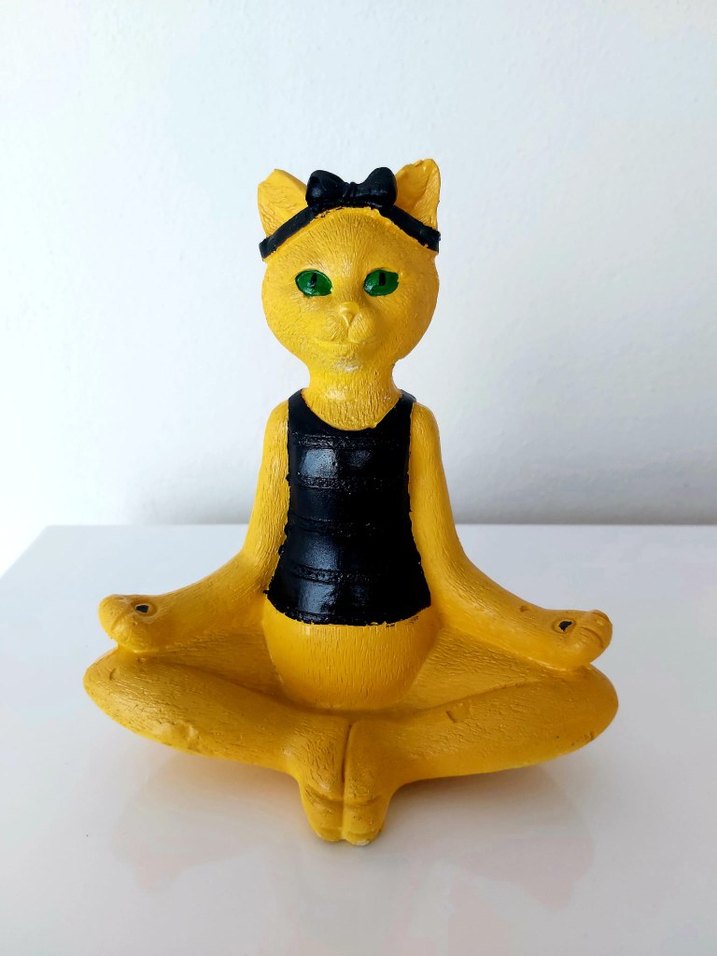 Siyah kıyafetli ve saç bandı takan, yoga pozunda oturan sarı renkli kedi biblosu. ♂️ çok güzeldir özel yapımdir istek üzerine atölyede yapilmistir hiçbir kusuru yoktur kaçıran yanar tektir muadili yoktur,kurdelali, yeşil gözlü antikadir 80 yıllık dede kolleksiyonundandır