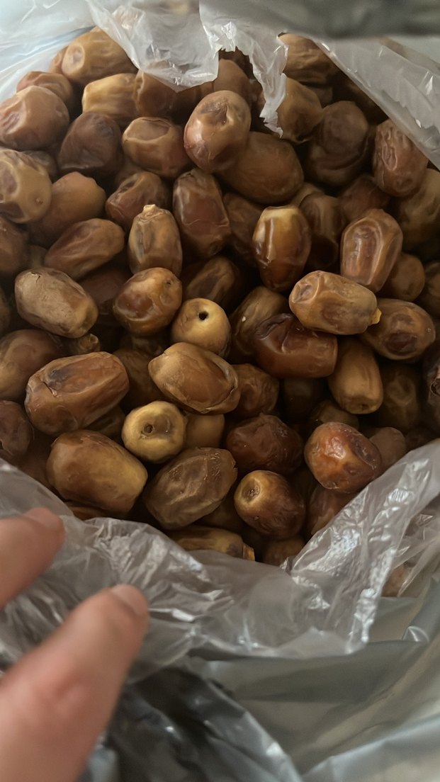 Sarı renkli, "PURE DATES, High Quality" yazılı yüksek kalite hurma kutusu. Hurma ve palmiye görseli içerir. Kestane ve hurma satışı mevcuttur