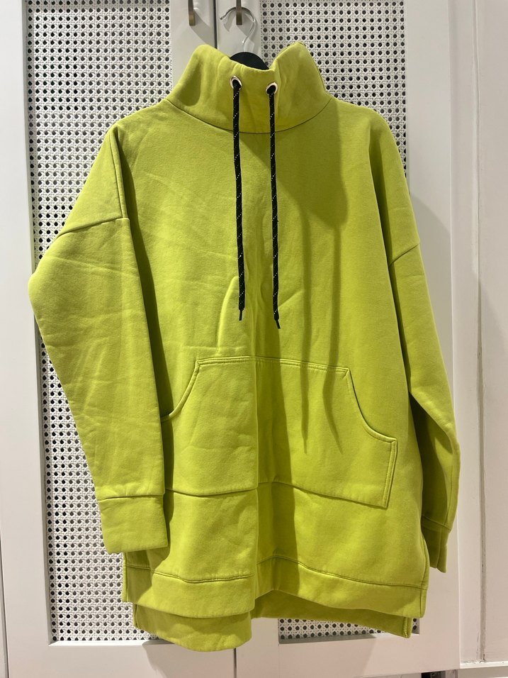 Sarı renkli, yüksek yakalı ve fermuarlı kadın sweatshirt. Yumuşak ve sıcak kumaştan, uzun kollu ve cep detaylıdır, rahat kullanım sağlar.