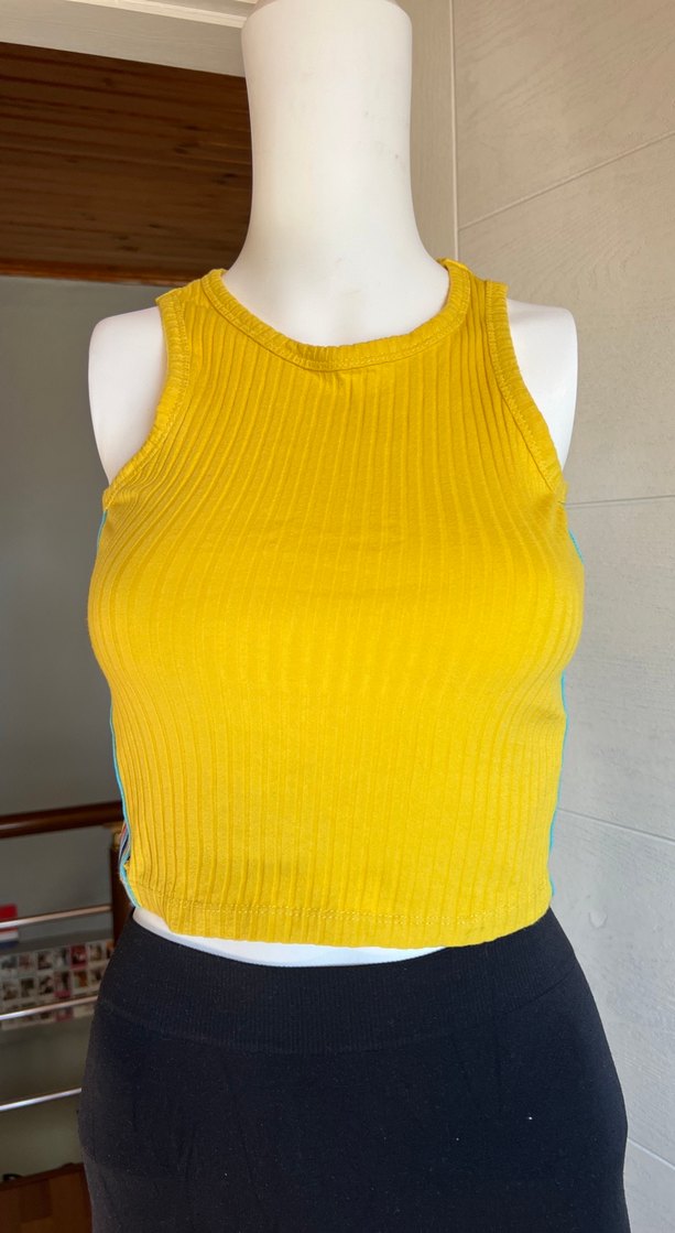 Sarı, yüksek yakalı, kolsuz ve vücuda oturan kadın atlet. Yumuşak sentetik kumaştan, pastel tonu günlük sokak stiline uygun.