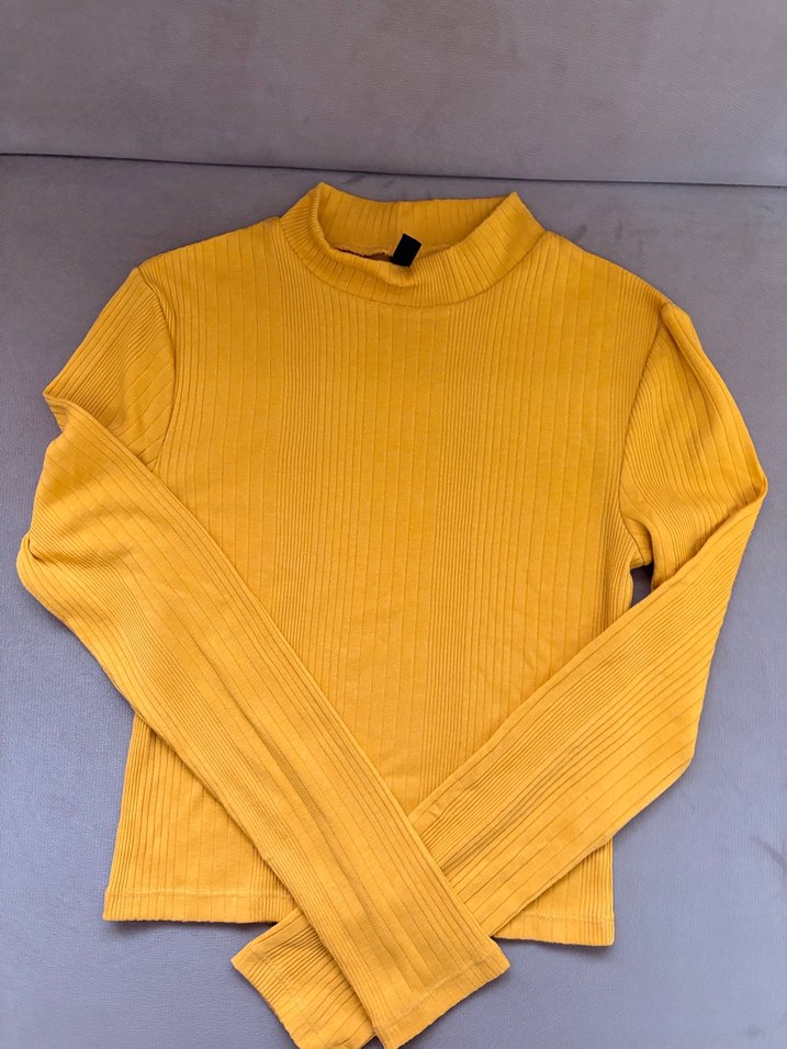 Sarı, yüksek yakalı ve uzun kollu, yumuşak ve sıcak kumaştan yapılmış, vücuda oturan günlük kullanıma uygun rahat bir sweatshirt.