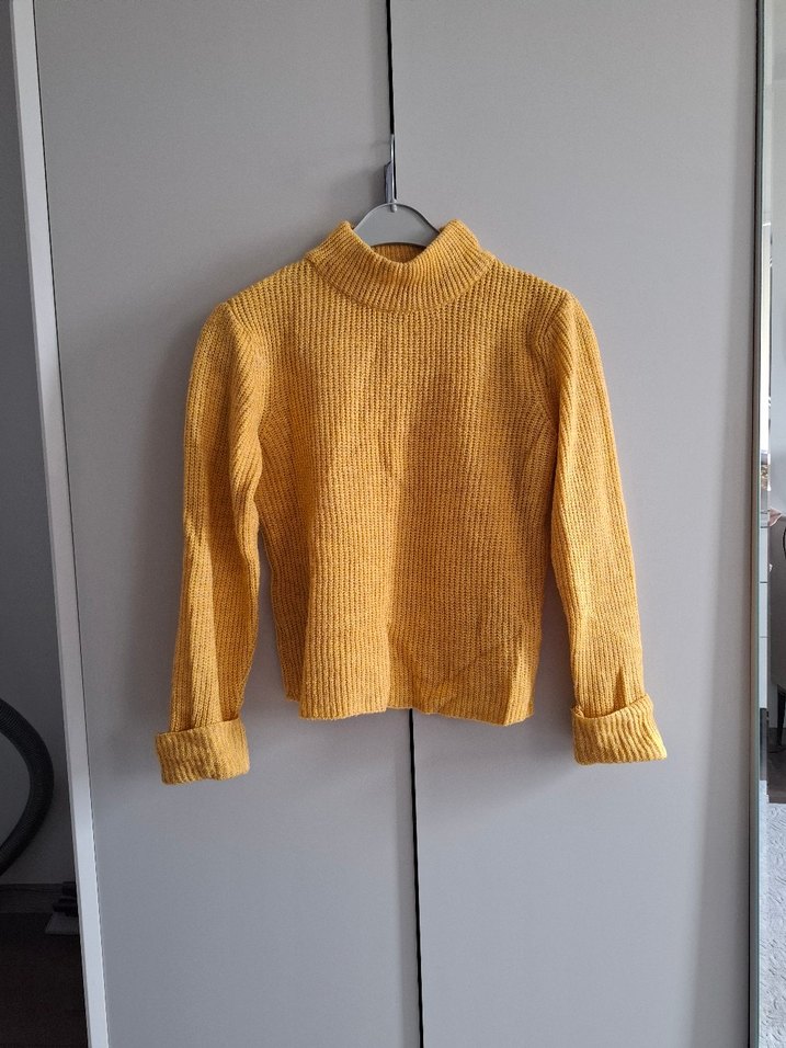 Sarı renkte, yüksek yakalı örgü kadın kazak. Uzun kollu, bol ve normal boyda, rahat ve şık günlük kullanıma uygun.
