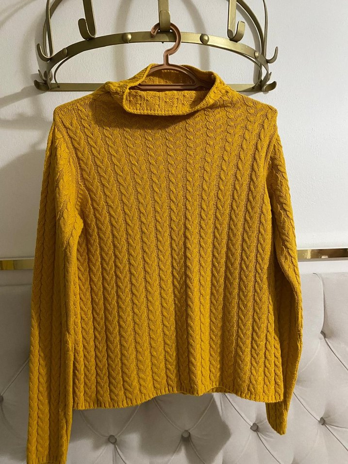 Sarı renkli, yüksek yakalı ve uzun kollu örgü kadın kazak. Rahat kesimi ve sıcak dokusuyla günlük kullanıma uygundur.
