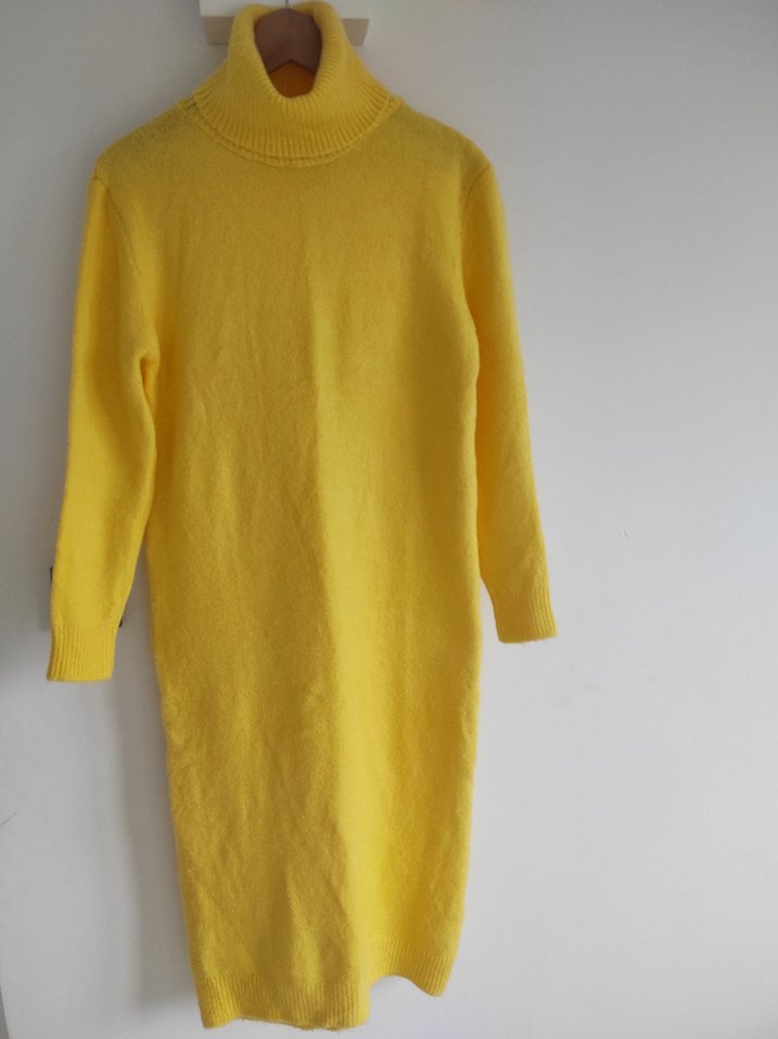 Sarı, yüksek yakalı, uzun kollu, triko elbise.. uzunluğu 115 cm.. M-L beden uyumlu..