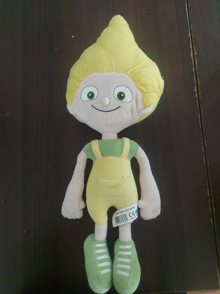 Yumuşak kumaştan yapılmış, pastel sarı renkte peluş oyuncak. Yeşil ayakkabı ve tulumlarıyla sevimli bir görünüme sahip.