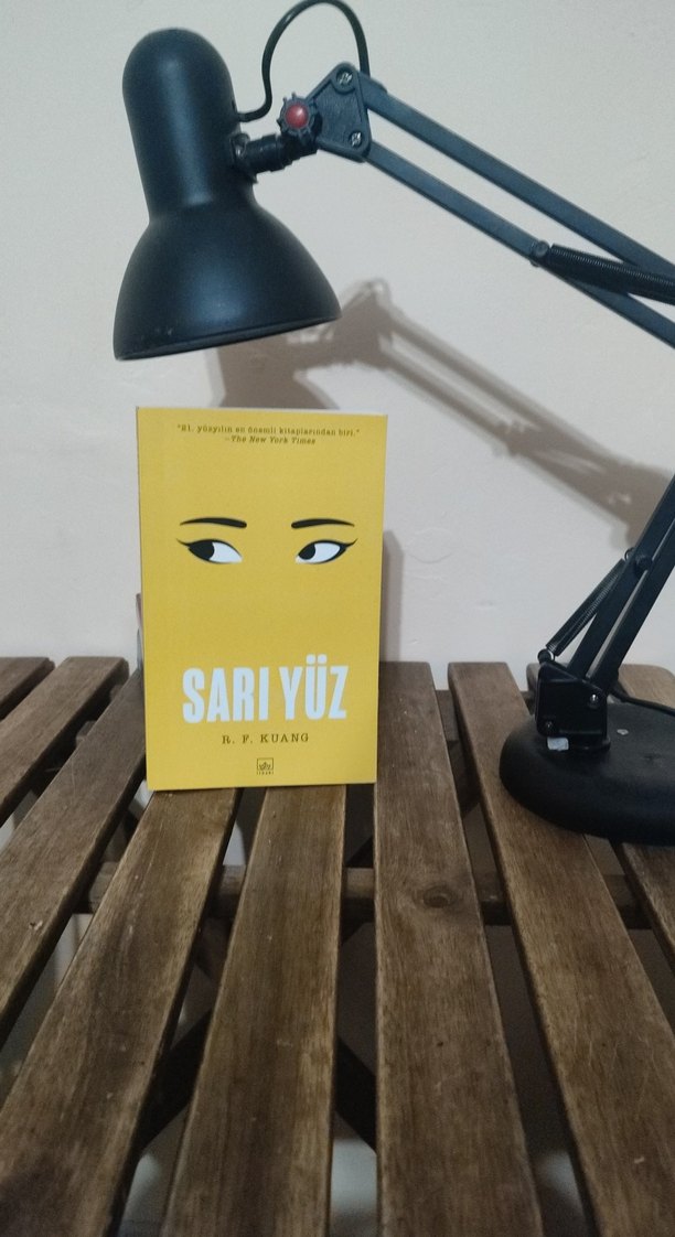 R. F. Kuang'ın "Sarı Yüz" adlı romanı, gözlerin minimalist çizimleriyle sarı kapaklı bir kitap.