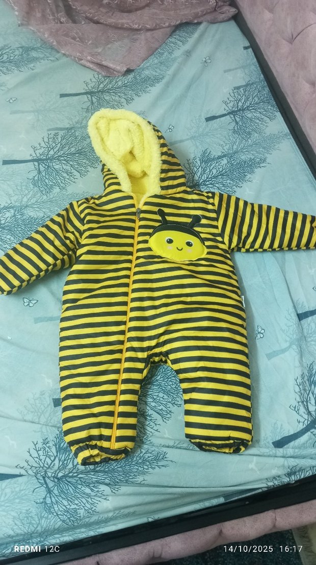 Renkli zebra desenli, fermuarlı ve kapüşonlu sarı bebek tulumu. Yumuşak ve sıcak kumaştan, elastik manşetli.