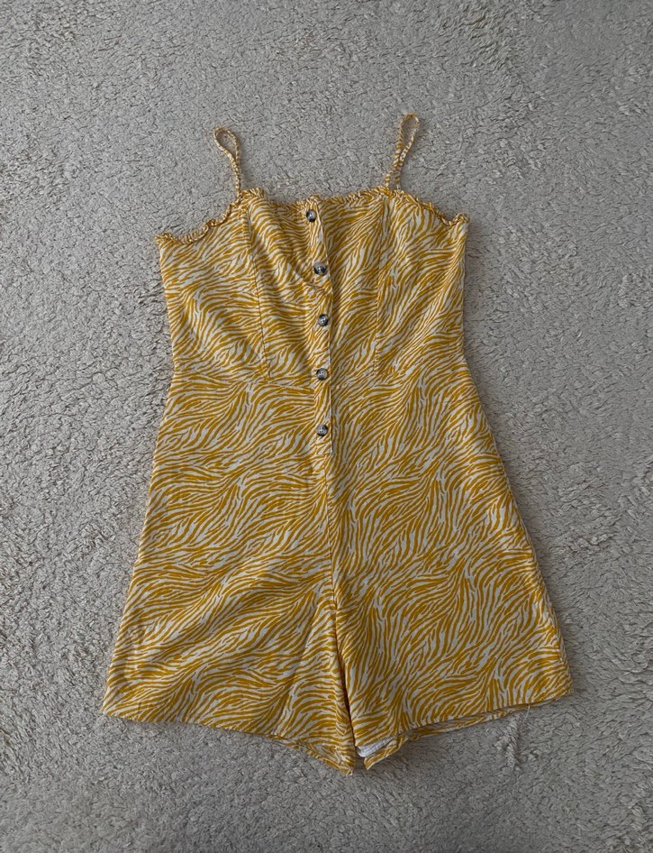 Sarı zebra desenli kadın tulum, askılı ve düğmeli ön tasarıma sahiptir. Rahat kesim ve midi boyda, sentetik kumaştan yapılmıştır, günlük kullanıma uygundur.